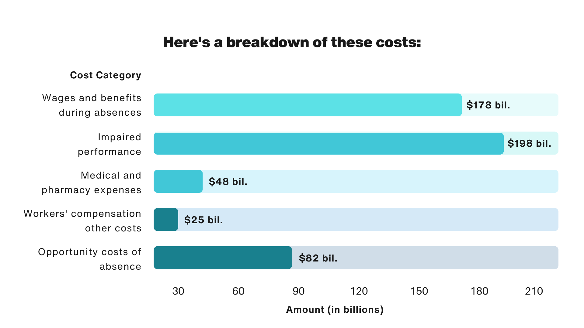 Absenteeism and poor employee health significantly impact U.S. businesses, leading to substantial financial losses. According to the Integrated Benefits Institute (IBI), in 2018, illness-related lost productivity cost U.S. employers approximately $530 billion annually. This figure encompasses various factors, including wages and benefits during absences, impaired performance due to chronic health conditions, medical and pharmacy expenses, workers' compensation costs, and opportunity costs from missed revenues and overtime.